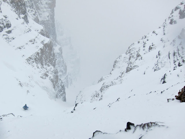 On top of the first ice flow there wasn't much in the way of anchors. The ice was crappy, so was the rock and the snow wasn't very deep. Two buried picks and a mediocre screw did the job.