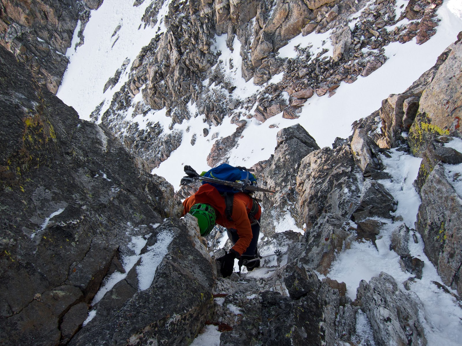 Trail breaking continued to be problematic all the way up the Southwest couloir where snow consisted of a thin breakable crust on top of more mushy snow. We fought this up to the notch. A short down climb and traverse over the East Face and we were on the summit, riding it like a horse. Pretty sure Andy even spanked it (the summit).
